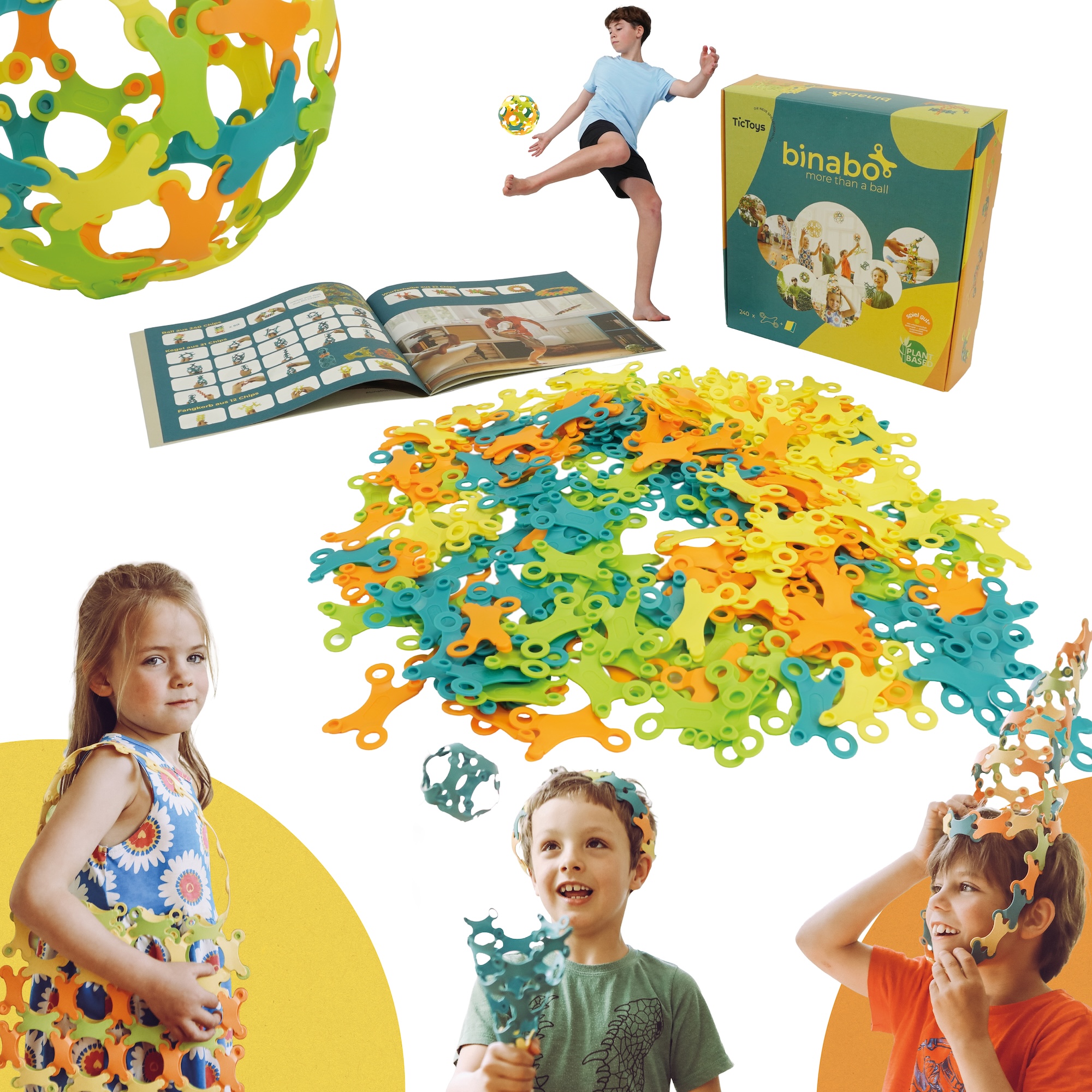 Das Set enthält eine umfangreiche Anleitung mit vielen Schritt-für-Schritt-Anleitungen und Spielideen für Gruppenaktivitäten – z. B. den Binabo-Wackelturm oder Teamspiele für drinnen und draußen.