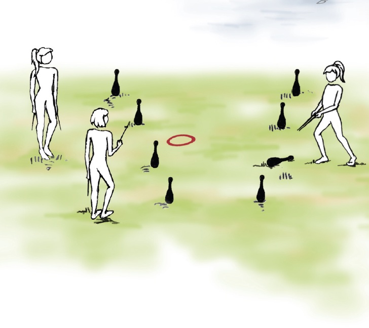 - Spielfeld: Jedes Team spielt dabei auf die Markierungen in unmittelbarer Nähe des gegenüberliegenden Teams, ähnlich wie beim Spiel KUBB.