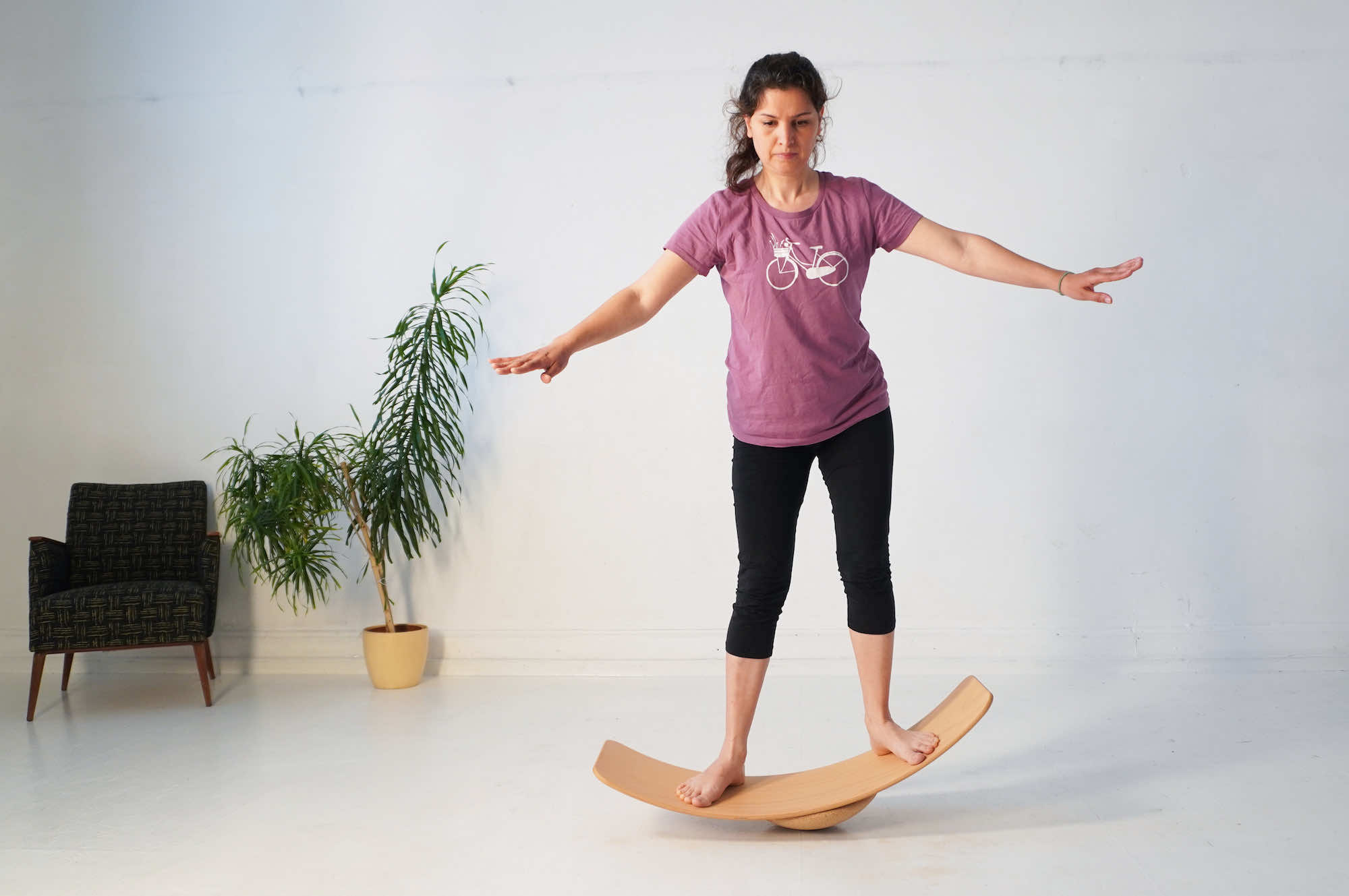 Beim Gleichgewichtstraining auf dem Wackler greifen sich die Zehen fest, das Fußgewölbe richtet sich auf. So wirkst du dem Senk-Spreizfuß(bzw. Plattfuß) entgegen. Balanciere auf einem Bein oder mit beiden Füßen auf dem Wackler, oder probiere dich an diesem Workout.