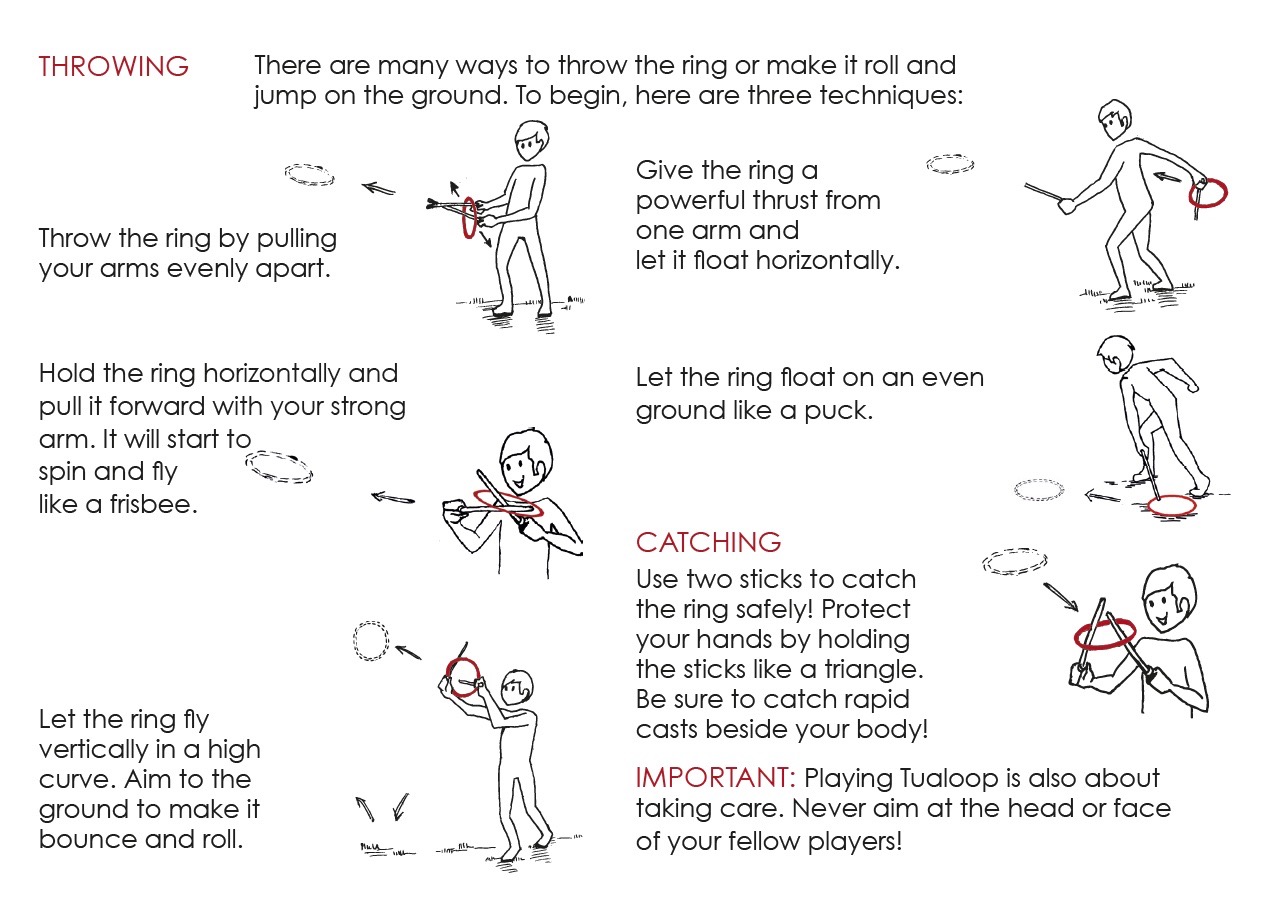 However, there are also various other throwing techniques, such as throwing with one hand, vertically or letting the disc bounce. Tualoop also offers certain games that can be played according to rules and for points. Both the different throwing techniques and the various game ideas are explained in detail below.